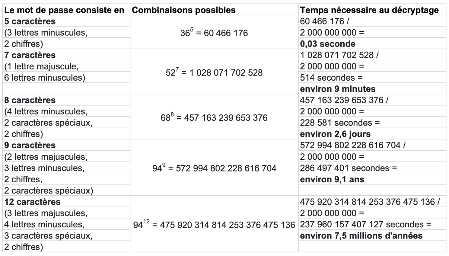 C’est la méthode la plus basique : tester toutes les combinaisons possibles de caractères jusqu’à trouver le bon mot de passe. Vous avez le nombre de combinaisons et le temps dans le tableau ci-dessus.